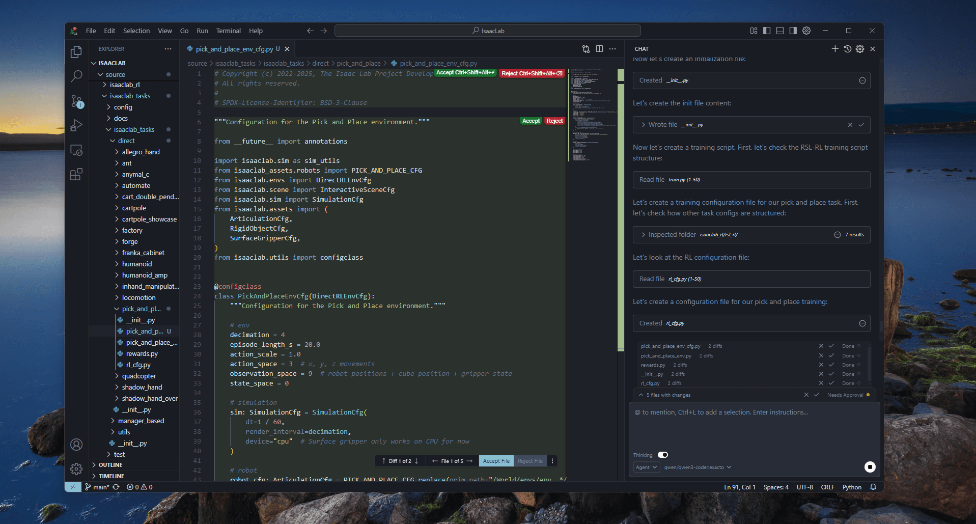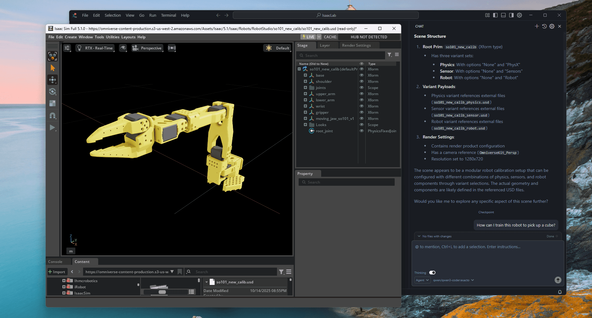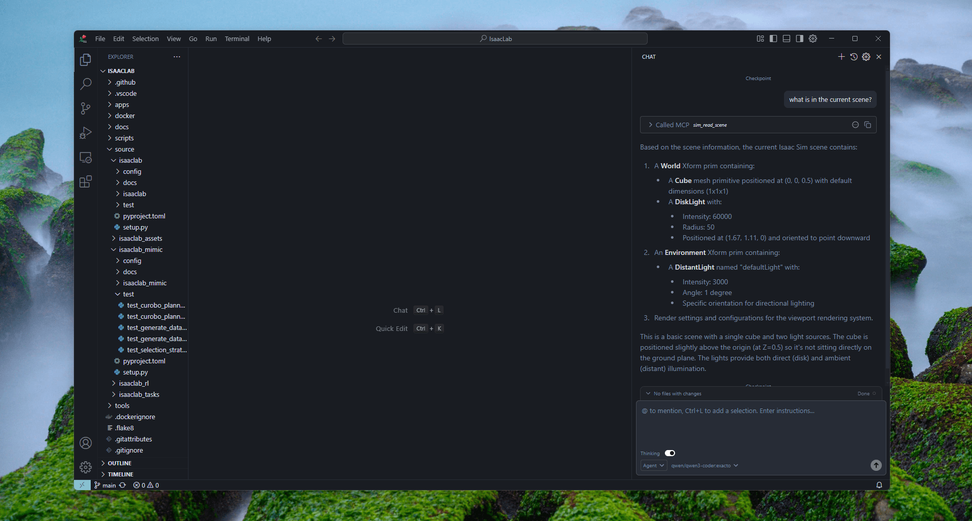 ROSE editor installs isaacsim & lab in a uv environment at /ROSE in your chosen directory. To use an existing install, just provide the location of your existing isaaclab folder during install. ROSE editor's AI agent has access to run python inside isaacsim via the rose editor extension, which is automatically installed and enabled on start. This gives it the power to view and edit any part of your project. With access to the complete isaacsim & lab documentation it can help you with anything you want to achieve. ROSE editor is capable of designing and writing complete robotics scenes and training scripts on its own, but is currently still a work in progress. The MCP is being improved everyday.